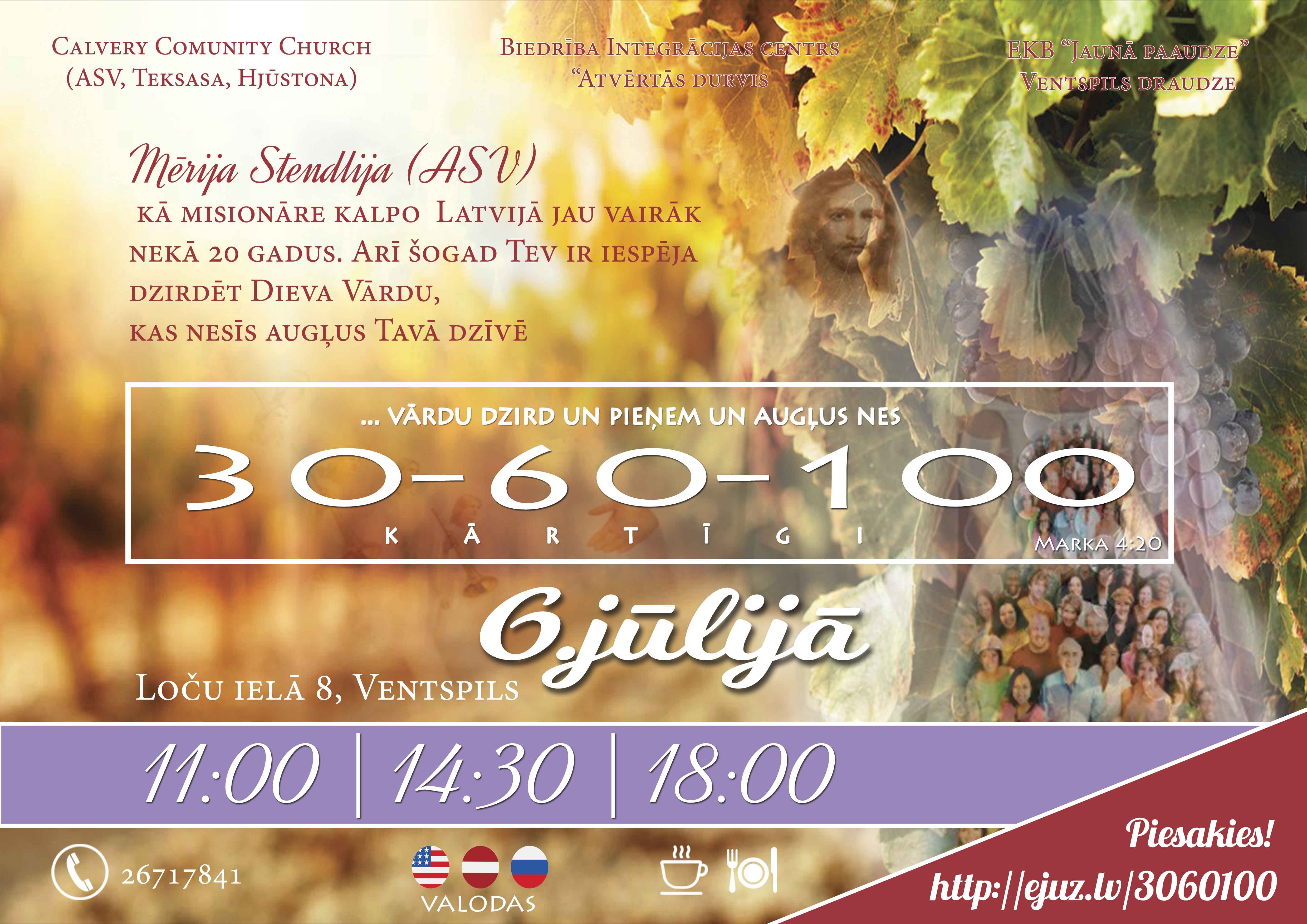 No 5-7.jūlijam Ventspilī, Loču ielā 8 notiks garīgās izaugsmes konference “30-60-100 kārtīgi”, ko organizē Calvery Community Church (ASV, Teksasa) sadarbībā ar EKB “Jaunā paaudze” Ventspils draudzi un biedrību IC “Atvērtās durvis”.