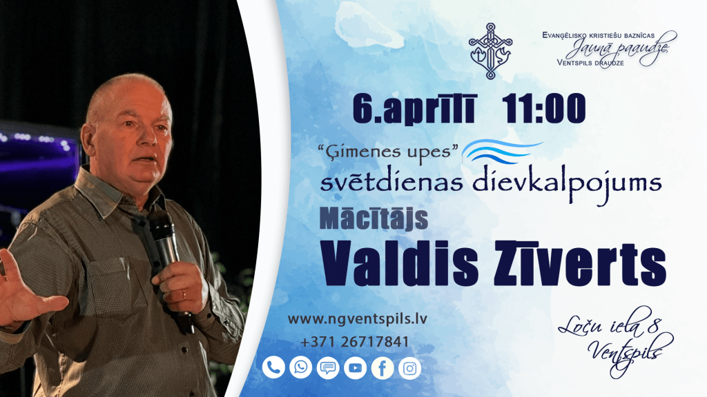 2025.gada 6.aprīlī plkst.11:00 Ventspils draudzē “Jauna paaudze” kalpos EKB “Jaunā paaudze” Kuldīgas draudzes “Dzīvības vārds” mācītājs Valdis Zīverts.