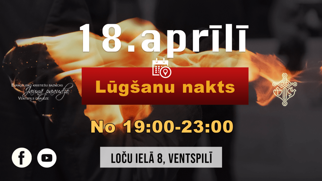 Ventspils draudzē “Jaunā paaudze” Ventspilī, Loču ielā 8 lūgšanu nakts sākums notiks ierastā piektdienas lūgšanas vakara laikā no plkst.19:00 un turpināsies līdz plkst.23:00. Pēc šī laika aicinām katru palikt nomodā un lūgšanā līdz sev iespējamam laikam.