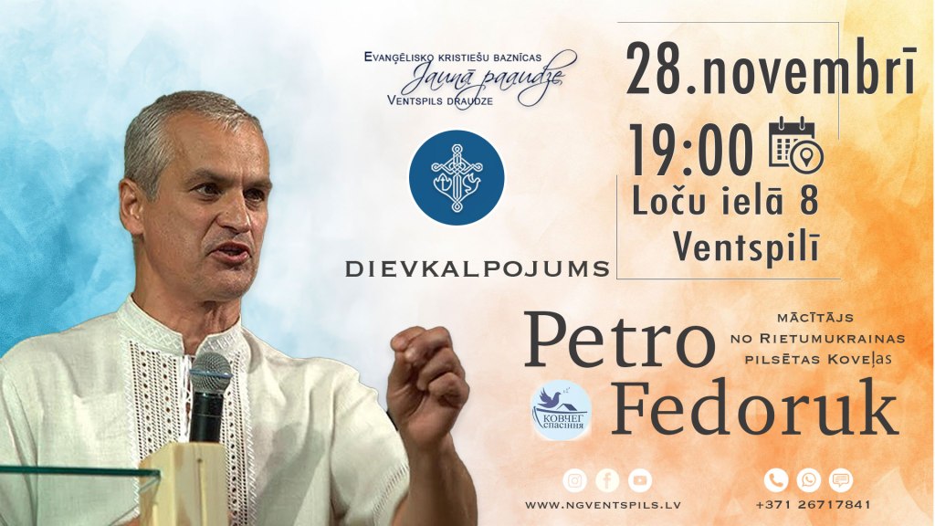 Piektdien, 28.novembrī plkst.19:00 Ventspils draudzē “Jaunā paaudze” kalpos mācītājs no Ukrainas rietumiem Petro Fedoruk (draudze “Glābšanas šķirsts”). Mācītājs Petro kara laikā ar savām 7 reģinonālajām draudzēm aktīvi iesaistījušies gan palīdzības sniegšanā karā cietušajiem, gan pats aktīvi iesaistījies teritoriālās aizsardzības spēkos. Ticība nāk no Dieva vārda dzirdēšanas un Dievs savu kalpu, mācītāju Petro, izmantojis, lai stiprinātu savas draudzes šajā ne vienkāršajā laikā. Katram no mums arī savos apstākļos ir nepieciešams Dieva vārda stiprinājums, tādēļ nāc un saņem savu maizi, ko Dievs sūta ar Saviem sūtņiem-praviešiem.