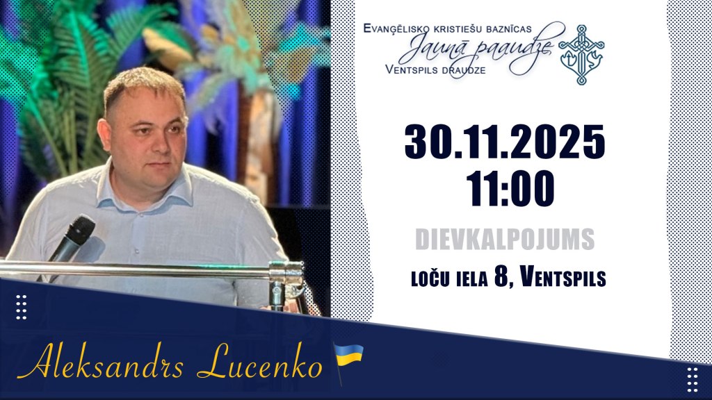 Svētdien, 30.novembrī Ventspils draudzē “Jaunā paaudze” kalpo mācītājs Aleksandrs Lutsenko. Katros apstākļos ir svarīgi ieraudzīt Dieva roku – un karš nepavisam nav laba lieta, tomēr pateicoties tieši tam, Dievs satuvina cilvēkus, kas citkārt viens otru nesastaptu.